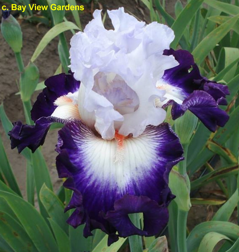 L’iris germanica “Center Of Universe” ha vessilli rbianchi con una leggera sfumatura blu; filamenti dello stilo blu-bianchi, ali viola reale intenso con al centro una macchia bianca a forma di stella, barbe rosso mandarino al centro, estremità bianche. Altezza 86 cm. Fioritura medio tardiva.