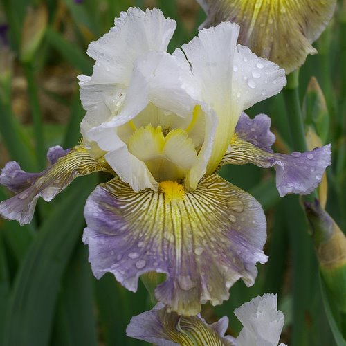 L’iris germanica “Ciel Gris Sur Poilly” ha vessilli bianco puro, ali grigio medio, barbe giallo oro, leggero profumo. Altezza 79 cm. Fioritura medio tardivo.