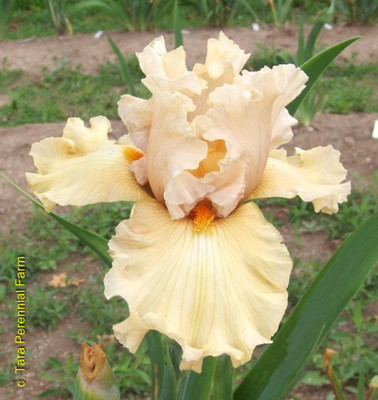 L’iris germanica “Comes The Dawn” ha vessilli e ali color albicocca chiaro, barbe color arancio-mandarino. Altezza 102 cm. Fioritura intermedia.
