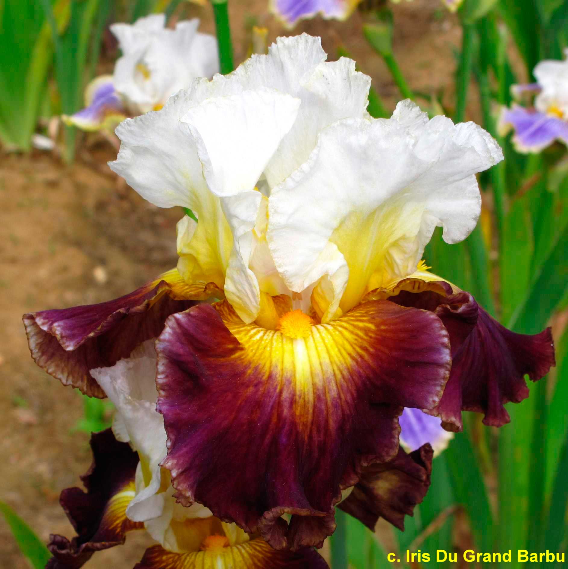 L’iris germanica “Fusion” ha vessilli giallo brillante, striature bianche sul bordo, leggere venature verdi alla base e alle nervature centrali, ali giallo brillante con raggi di sole sulle barbe che sfumano al rosso rubino, poi sfumano al prugna, riflessi blu lavanda sui 3/4 inferiori del petalo, bordo blu sulla metà superiore del petalo, bordo marrone chiaro sulla parte inferiore, barbe gialle. Altezza 89 cm. Fioritura tardiva o molto tardiva.