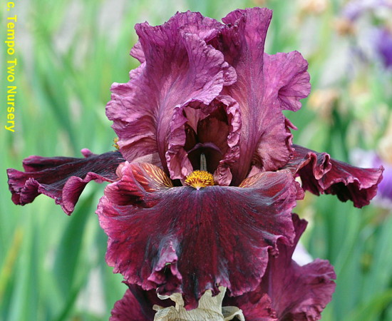 L’iris germanica “Obsessed” ha vessilli rosso bordeaux, più chiari a livello delle nervature centrali, ali rosso-bordeaux-marroni, barbe color bronzo senape, leggero profumo muschiato. Altezza 94 cm. Fioritura intermedia.