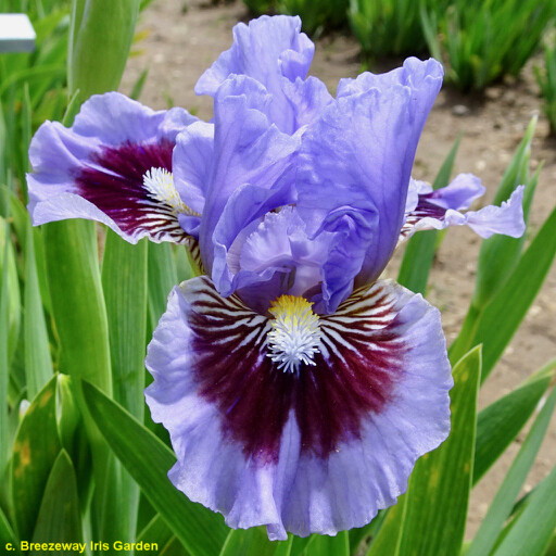 L’iris germanica “Oh Canada” ha vessilli azzurro chiaro, ali blu sfumate con una macchia centrale marrone con raggi bianchi che si irradiano dalla barba, barbe gialle nella gola, estremità blu con punte bianche, leggera fragranza. Altezza 33 cm. Fioritura precoce.