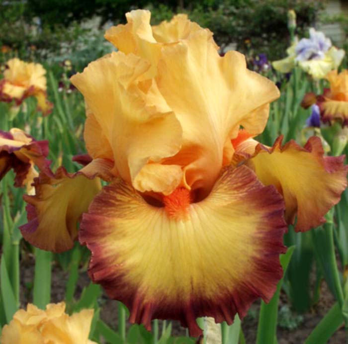 L’iris germanica “Ringtone” ha vessilli giallo oro con leggero tono di rosso pesca più pronunciato alla base, ali uguali, fascia marginale di colore rosso, barbe di un solido arancione indiano. Altezza 91 cm. Fioritura intermedia.