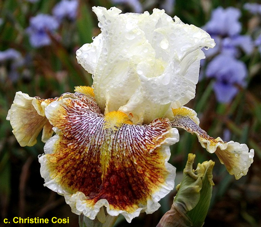 L’iris germanica “Variegated Wonder” ha vessilli bianco caldo, ali bianche con fondo bordato e punteggiato di rosa prugna che virano a un tono più chiaro sul terzo centrale, più scuro sul terzo inferiore, bordo quasi bianco pallido, peli della barba bianchi, punte gialle medio, profumo leggermente dolce. Fogliame variegato. Altezza 102 cm. Fioritura da intermedia a tardiva.