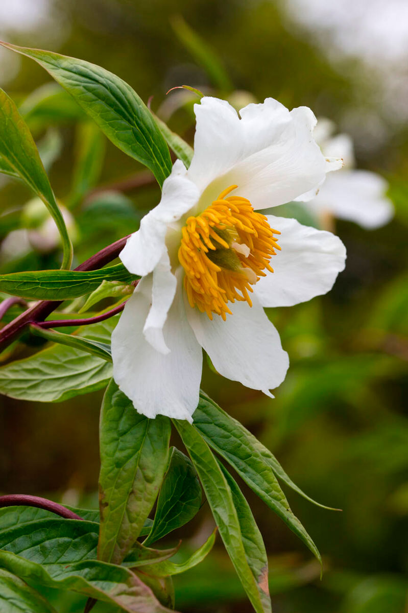 La peonia ibrida erbacea “Early Windflower” ha un fiore bianco, piccolo, delicato, semplice e leggermente pendulo (con boccioli laterali); ibrido di Emodii. Il profumo è assente e la fioritura è precoce.