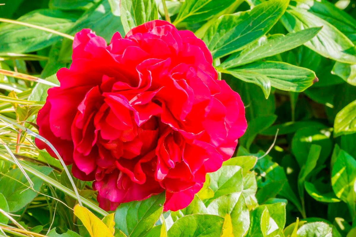 La peonia ibrida erbacea “Edgar Jessep” ha un fiore rosso, doppio, pieno e grande a stelo singolo e leggermente inclinato; ibrido di Peonia Officinalis. Il profumo è assente e la fioritura è tardiva.