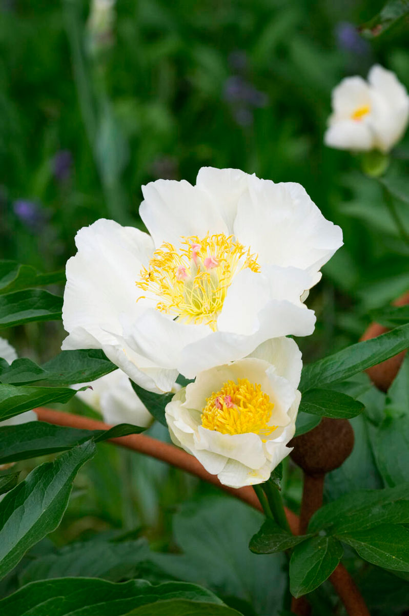 La peonia ibrida erbacea “Quad” ha un fiore semplice, dal giallo pallido al bianco crema. Il profumo è assente e la fioritura è precoce.