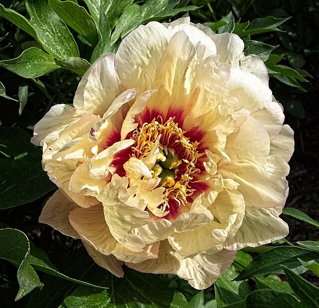 La peonia “Callie’s Memory” è un ibrido intersezionale (Itoh) dal fiore grande, da semidoppio a doppio di color giallo crema con sfumature che vanno dal crema, al giallo, all’albicocca e con i bordi screziati di rosa; gola bordeaux scuro quasi marrone e dalla fioritura intermedia.