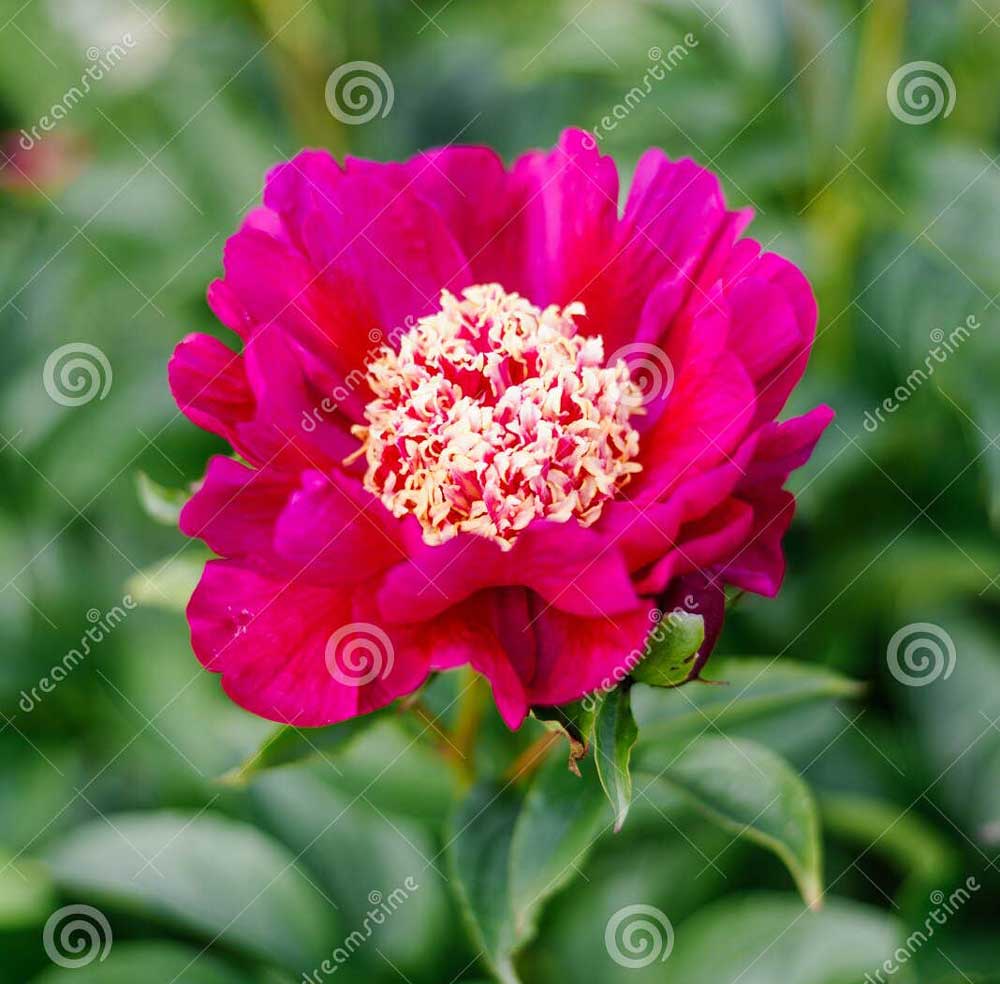 La peonia lactiflora “Charles Burgess” ha un fiore ad anemone giapponese rosso bordeaux con petali dal bronzo al giallo. Il profumo è assente e la fioritura è tardiva.