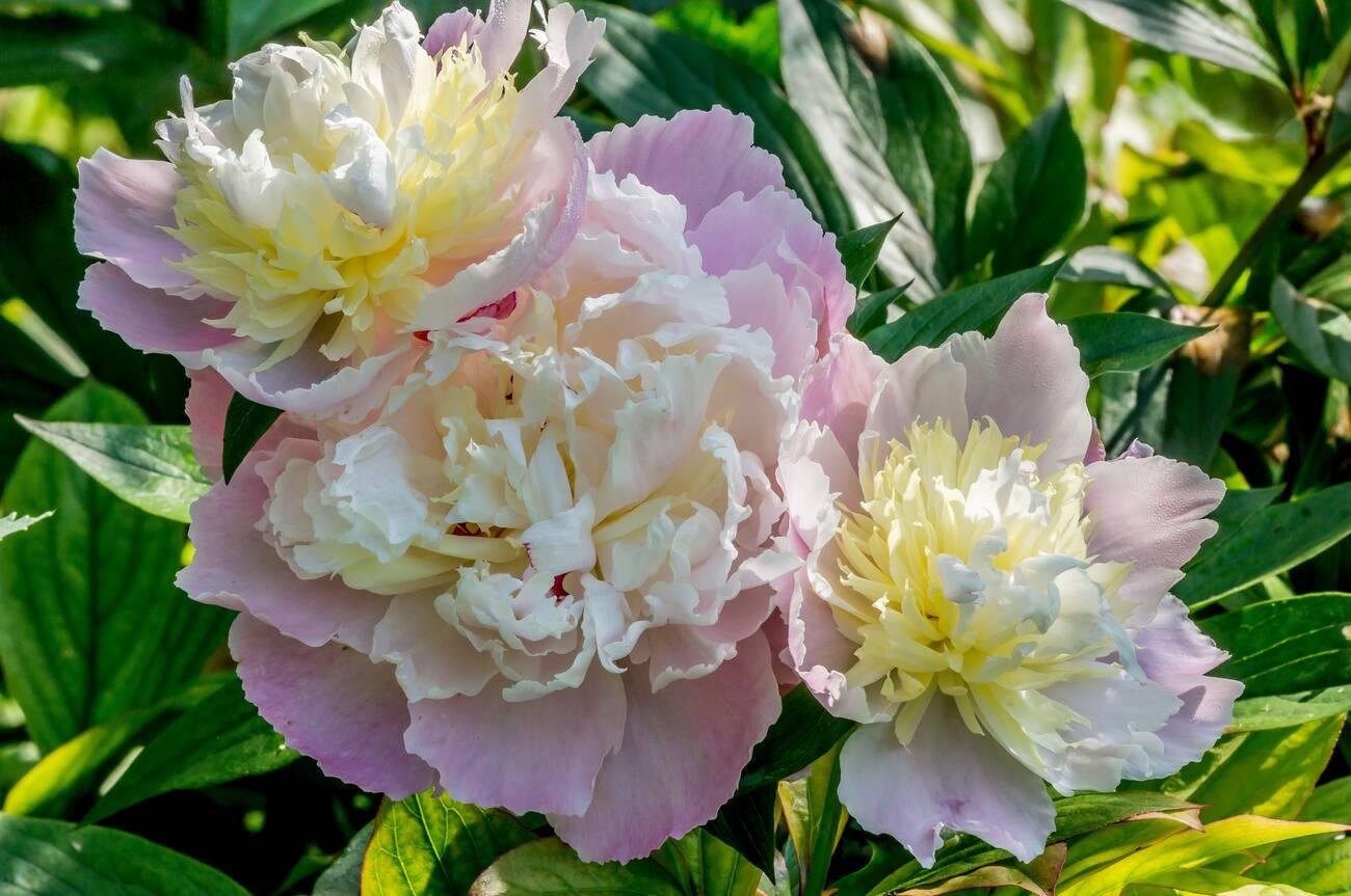 La peonia lactiflora “Jeanne D’Arc” ha un fiore doppio di grandi dimensioni a forma di anemone giapponese, ottimo per il reciso. I petali esterni dagli angoli smussati sono di color rosa pallido con al centro un cuore arruffato fatto da petali bianchi sfumati di giallo crema. Il profumo è intenso e la fioritura è medio tardiva.