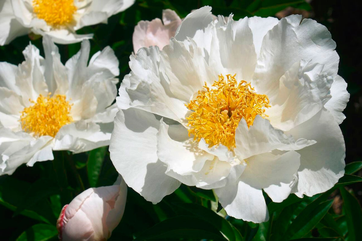 La peonia lactiflora “Krinkled White” ha un fiore semplice bianco con petali grandi e ondulati e con numerosi boccioli laterali. Il profumo è leggero e la fioritura è tardiva.