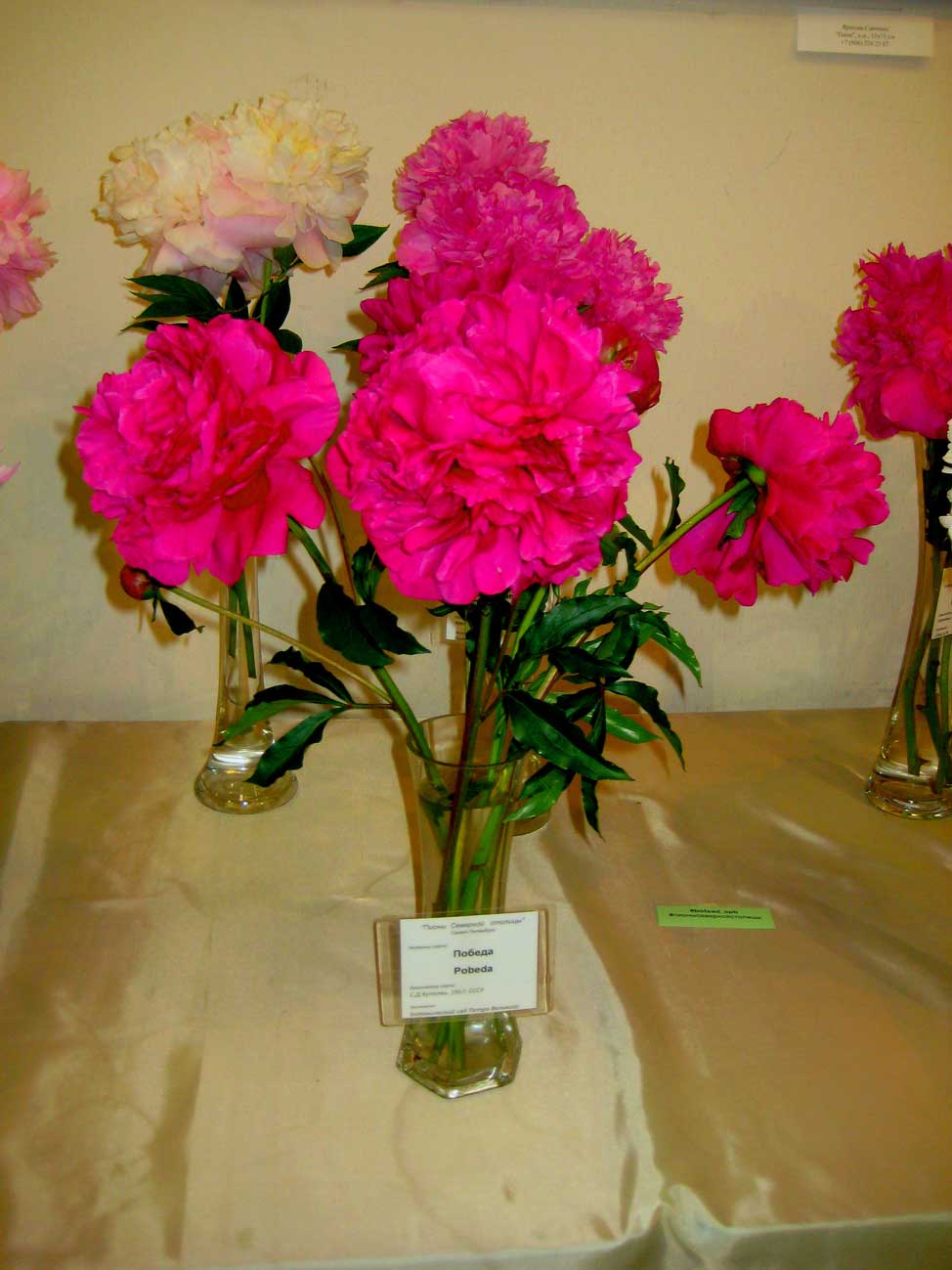 La peonia lactiflora “Pobeda” ha un fiore doppio, grande e largo di color rosso porpora tendente al magenta. Il profumo è assente e la fioritura è tardiva.