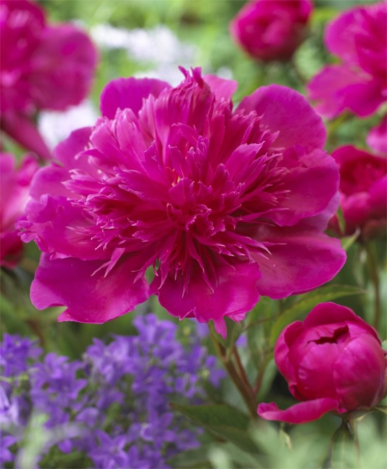 La peonia lactiflora “Purple Spider” ha un fiore doppio dai petali esterni viola-fucsia bordati di rosa, pieni di petaloidi fucsia-violacei simili a ragni, con occasionali riflessi bianchi scintillanti. Il profumo è assente e la fioritura è intermedia.