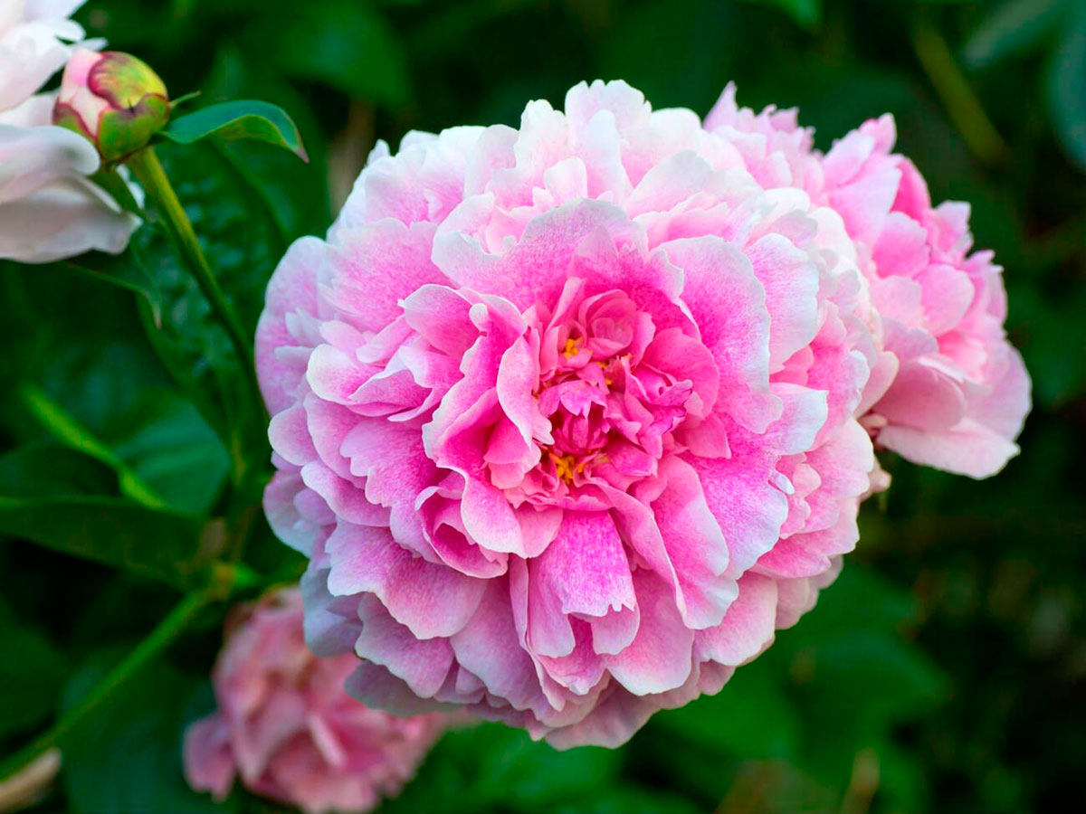 La peonia lactiflora “The Fawn” ha un fiore doppio, grande, rosa allegro con punteggiature di rosa più carico. Il profumo è assente e la fioritura è intermedia.