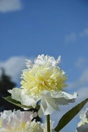 La peonia lactiflora “Top Brass” ha un fiore doppio, grande, ad anemone giapponese o globoso, ottimo per il reciso. I petali esterni sono di colore bianco, al centro troviamo un ciuffo di petali color giallo tenue sovrastati petaloidi rosa pastello. Profuma e la fioritura è medio tardiva.